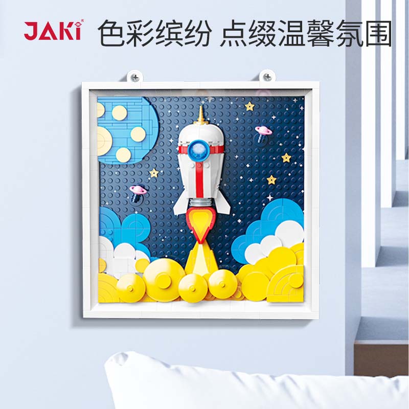 遠征星辰,萌趣立體積木畫;3D立體設計,層次感豐富,趣味性滿滿;萌趣火箭騰空而起,飛向浩瀚星空;金黃色的火焰,照亮天穹;