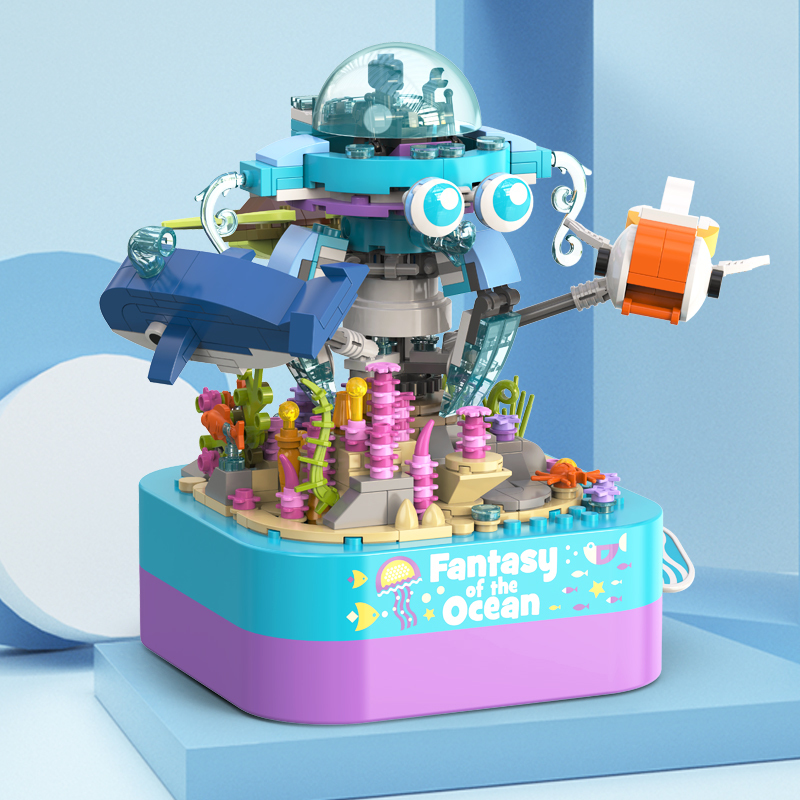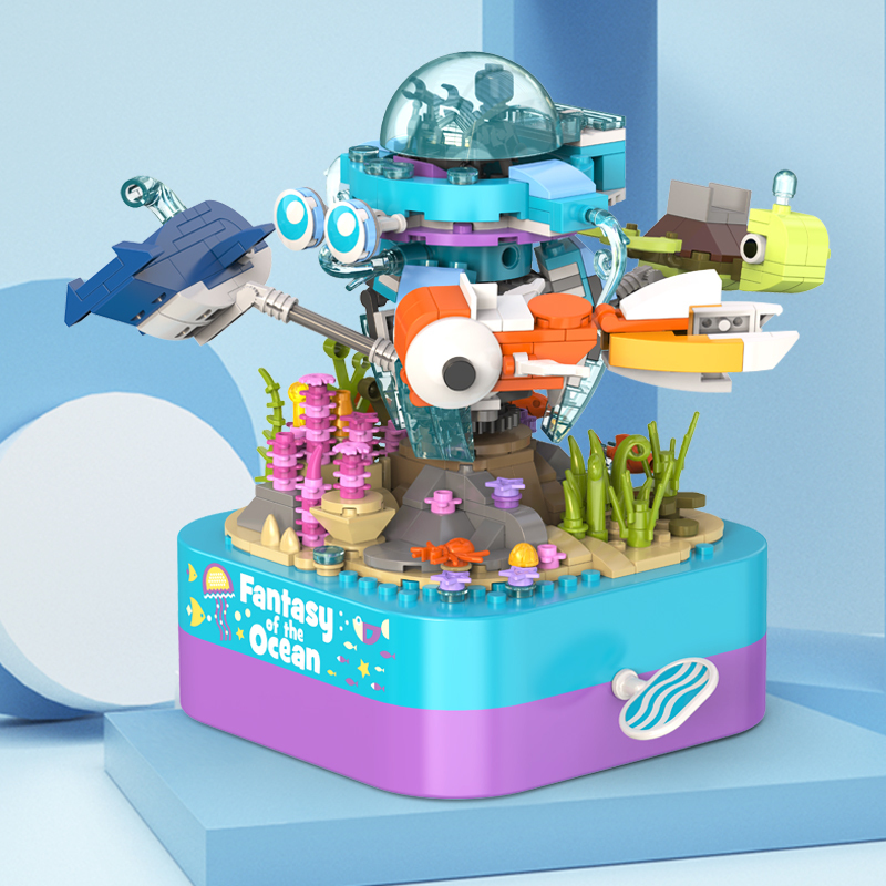 將積木與音樂盒完美結合,好玩又時尚。純機械動力設計更環保,音樂盒發條轉動帶動整個海洋館旋轉,益智拼搭,時尚美觀,還能充當家居精品擺件。
